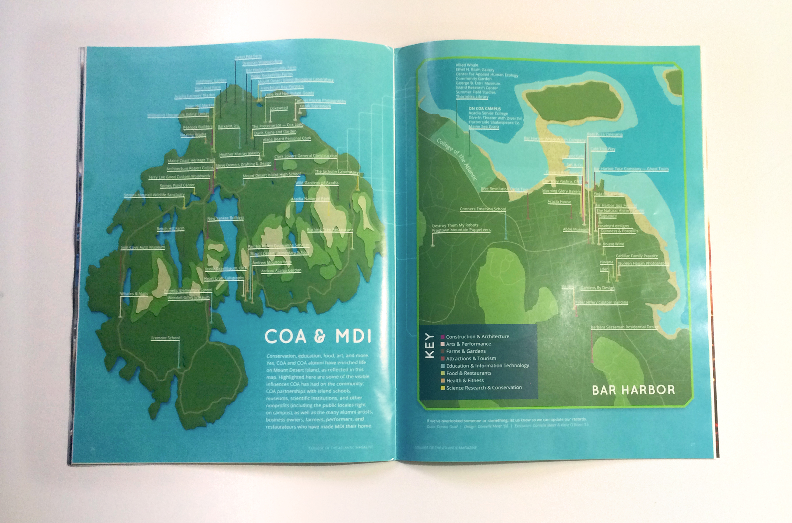 As part of the greater COA Magazine redesign at College of the Atlantic, we came to the conclusion that we wanted more visual storytelling. As part of this we created infographics and maps to supplement many little pieces of information.