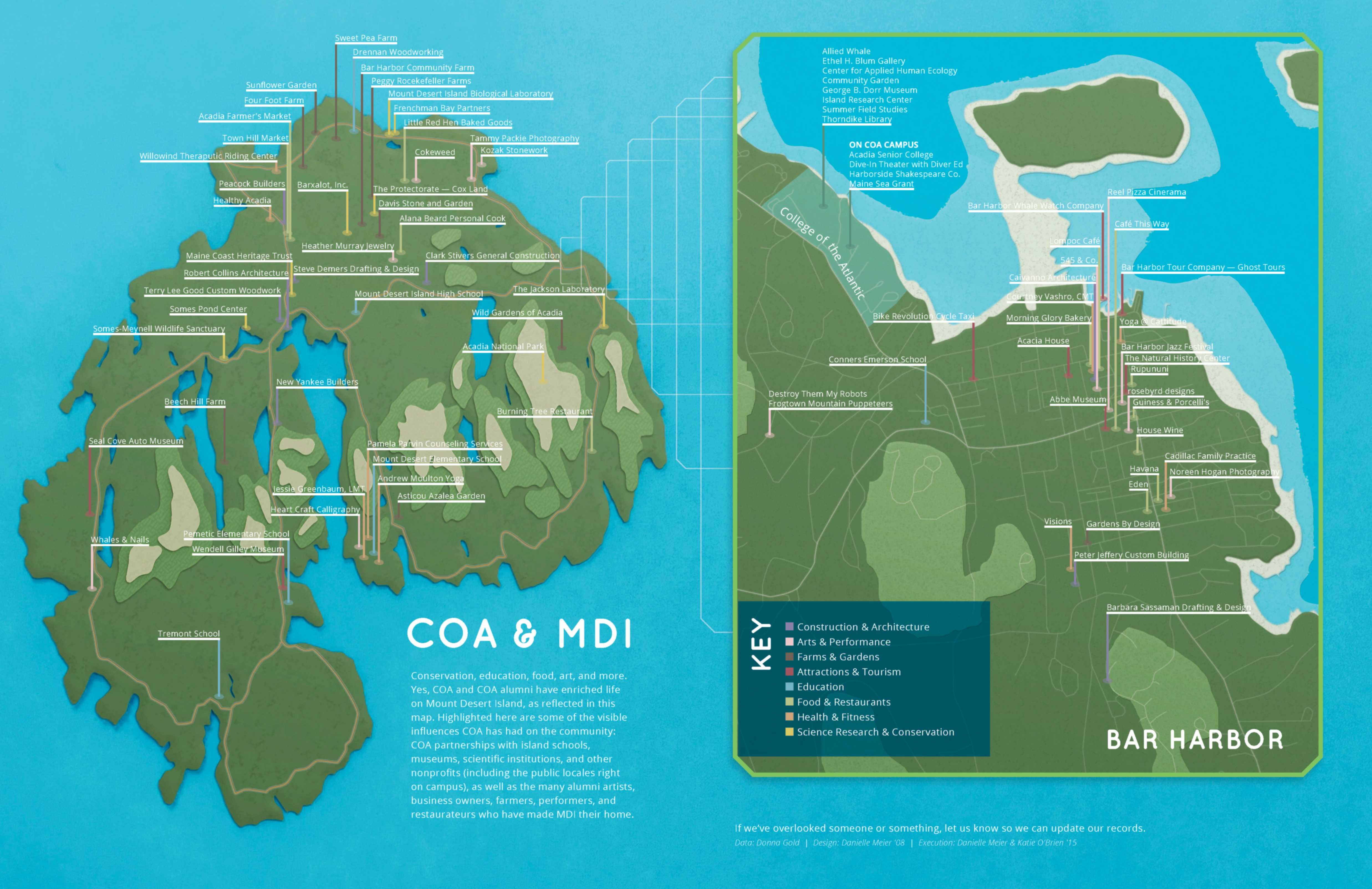 One of the projects we worked on was creating a map of Mount Desert Island mapping all of the alumni connections to various companies that were started or hold several connections to COA.