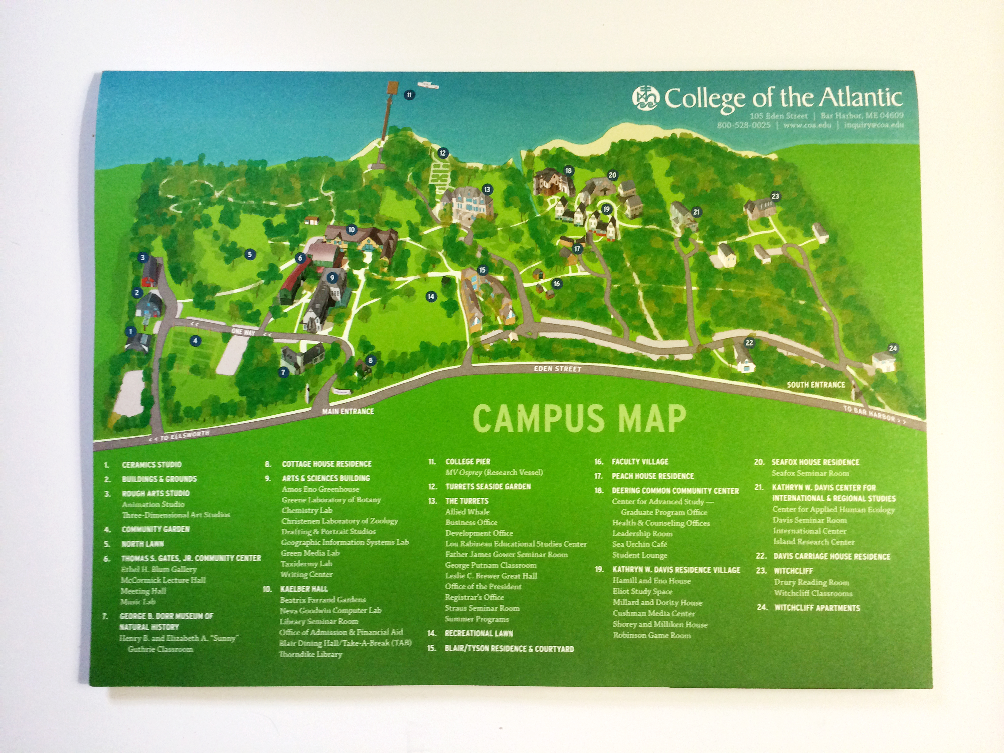 It has been a while — over ten years — that College of the Atlantic has had an illustrated campus map. This was a big project that required making illustrations of all buildings on campus. Our summer months were dedicated to creating the unique campus on a two-dimensional plane. It was a fun and lengthy endeavor.