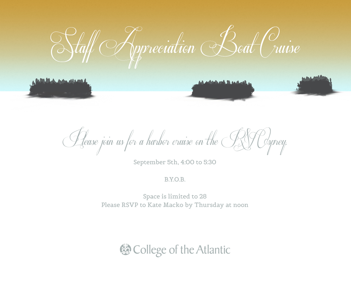 Inspired by little Maine islands filled with pines during sunset, this was an invitation Porcupine Design illustrated and designed for a COA staff bay cruise off of Bar Harbor in the middle of fall.